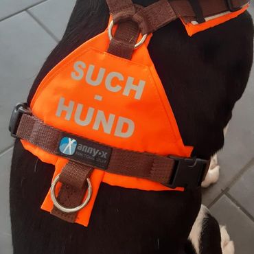 Eine Signalhalsung, Warnweste oder Halstuch für den Suchhund, womit er ausschließlich im Arbeitsmodus sucht.